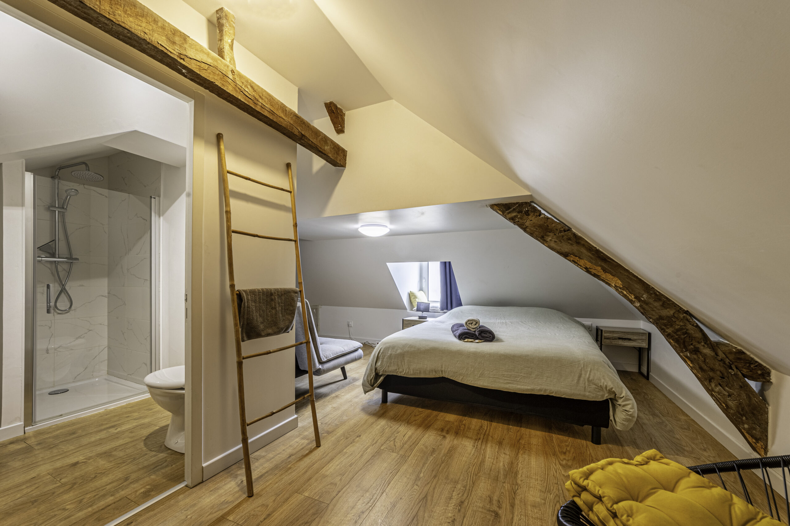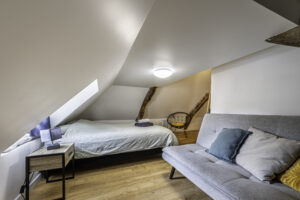 À noter : la chambre étant située sous les combles, les personnes de grande taille devront simplement faire attention près de la fenêtre. L’accès au lit reste facile.